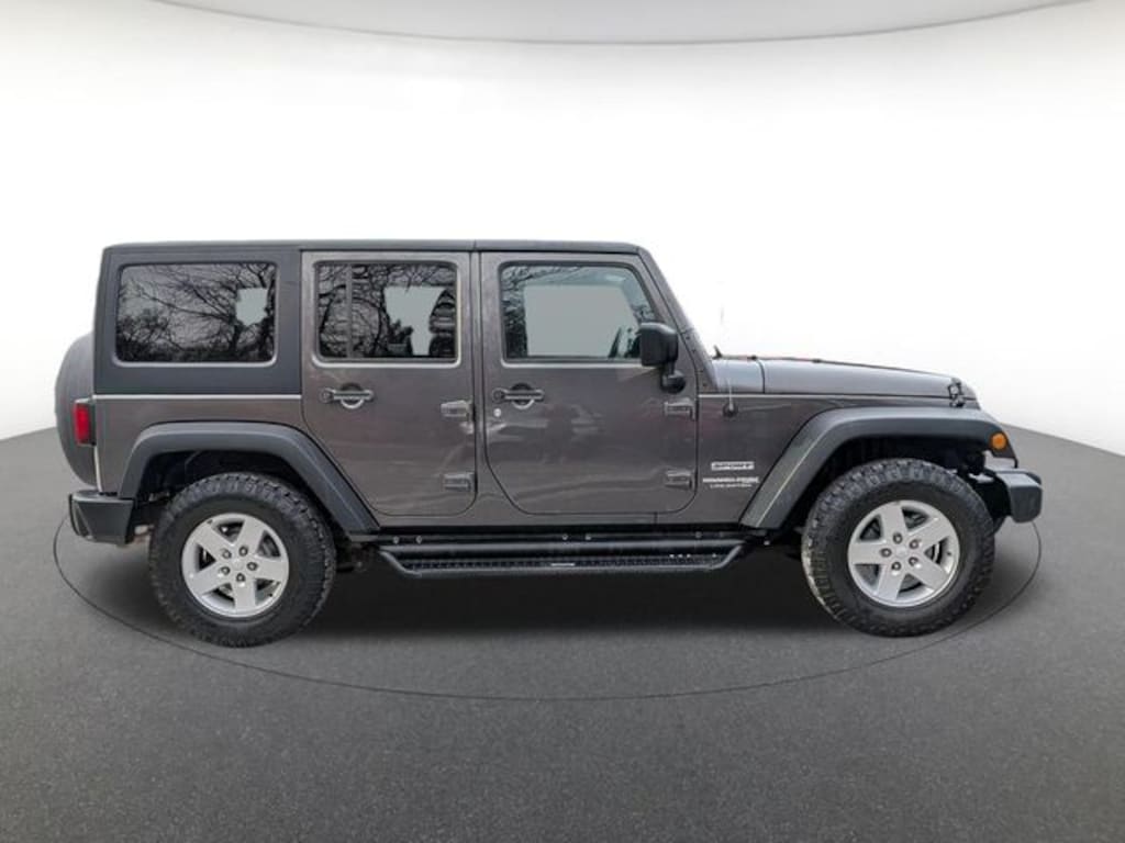 Power Convenience Group (Auto-Dimming Mirror w/Reading Lamp, Front 1-Touch Down Power Windows, Power Heated Mirrors, Power Locks, Remote Keyless Entry, and Security Alarm), Quick Order Package 24S Sport S, Wrangler JK Unlimited Sport, 30 day Warranty, 4D Sport Utility, 3.6L V6 24V VVT, 5-Speed Automatic, 4WD, Granite Crystal Metallic Clearcoat, Black Cloth, 16" x 7.0" Luxury Styled Steel Wheels, 3.21 Rear Axle Ratio, 4-Wheel Disc Brakes, 8 Speakers, ABS brakes, Air Conditioning, AM/FM radio, Audio Jack Input for Mobile Devices, Black 3-Piece Hard Top, Brake assist, CD Stereo, Cloth Seats w/Adjustable Head Restraints, Compass, Driver door bin, Driver Height Adjuster Seat, Driver vanity mirror, Dual front impact airbags, Electronic Stability Control, Freedom Panel Storage Bag, Front anti-roll bar, Front Bucket Seats, Front Center Armrest w/Storage, Front fog lights, Integrated roll-over protection, Low tire pressure warning, Manufacturer's Statement of Origin, Normal Duty Suspension, Occupant sensing airbag, Outside temperature display, Passenger door bin, Passenger vanity mirror, Power steering, R1234YF A/C Refrigerant, Radio: 130, Rear anti-roll bar, Rear Window Defroster, Rear Window Wiper/Washer, Speed control, Split folding rear seat, Steering wheel mounted audio controls, Sunrider Soft Top, Supplemental Front Seat Side Airbags, Tachometer, Tilt steering wheel, Traction control, Trip computer, and Variably intermittent wipers.